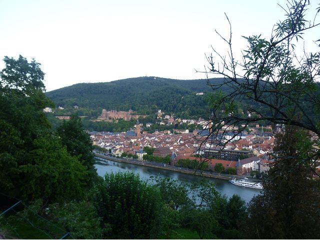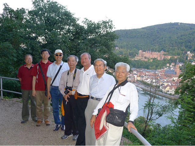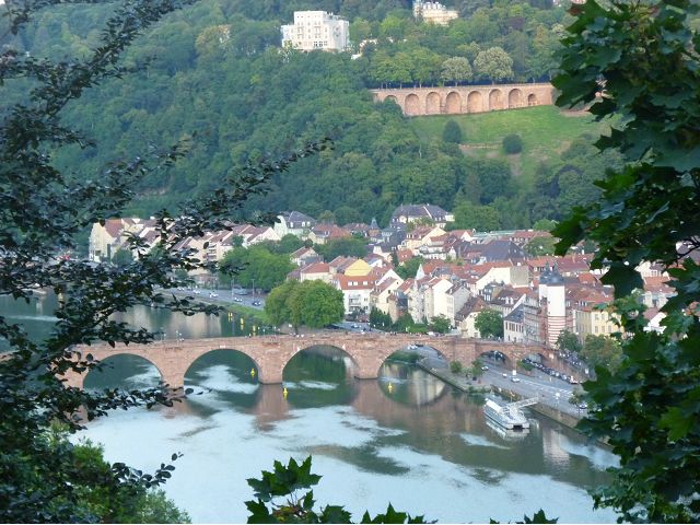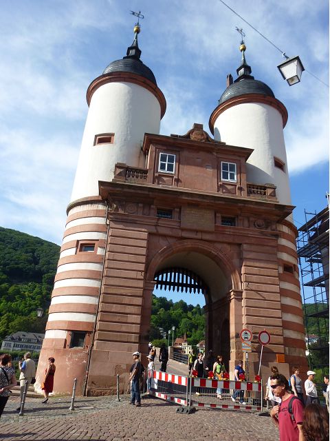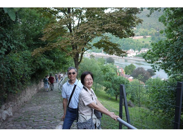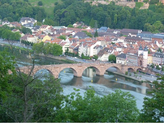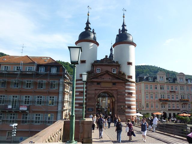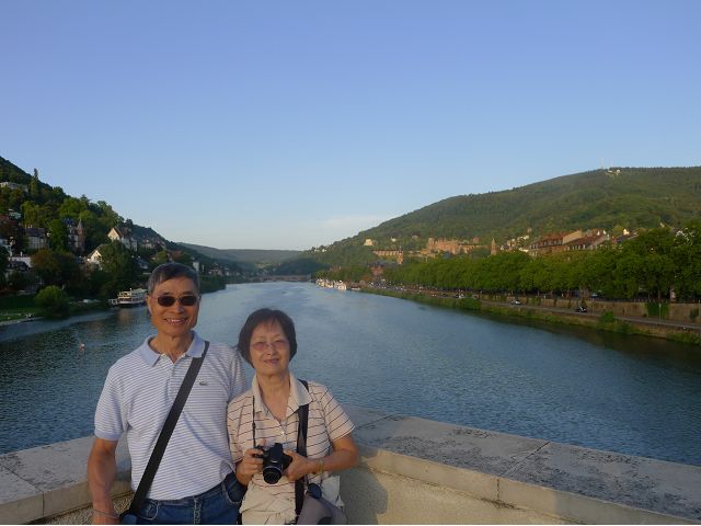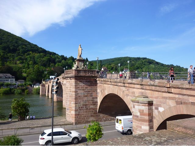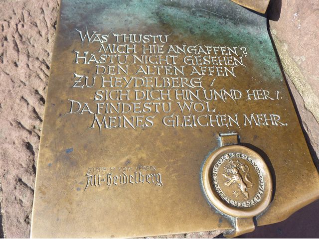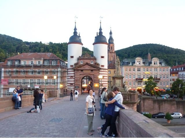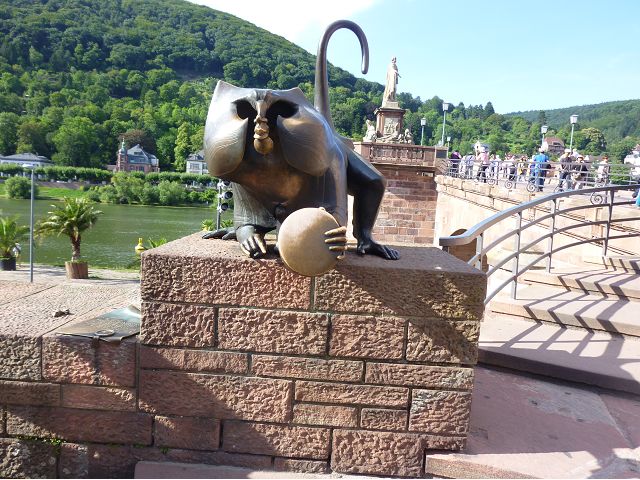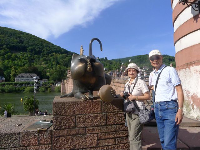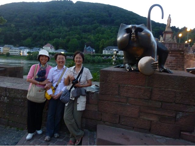 晚餐後,領隊帶領遊覽古橋和哲學家之道(Philosophenweg)。早年,橫跨內卡河的木橋老是被沖毀,選帝侯為解決兩岸交通難題,而於1788年利用沿河岸的砂岩搭建一座長200公尺、寬7公尺石橋,連接老城與河對岸,靠舊城區端蓋有城門,以防止法軍進犯。從舊城區走上老橋,看古橋橋身古樸典雅,9座紅色砂岩拱門優雅橫跨河面,海德堡城堡矗立後方山坡,構成一幅吸引世人的海德堡風景。橋頭兩座白色圓柱狀塔樓高聳,據說原本就是海德堡舊城牆的城門,依舊護衛著老城的入口,古橋目前供行人徒步專用,橋面略見磨損。圓柱狀塔樓城門旁邊一座猿猴銅像(Brückenaffe),稱為"海德堡之猴",是非常討遊客喜歡的地標,遠較橋上選帝侯Elector Karl Theodor及希臘神話女神雅典娜(Pallas Athene)兩座雕像知名多了,緣銅猴左手拿著一面銅鏡,鏡面正對著往來行人,彷彿要讓人從鏡子中看清自我,其旁還有兩隻銅雕小老鼠,傳說碰觸猴子的手指會再來海德堡,摸鏡子會招來財富,摸小老鼠則會多子多孫云,寧可信其有的遊人不少,看,多處銅面都被摸光滑啦。更有趣的是,旁側貼著寫德文的那一面銅版:「Was thustu mich hie angaffen? Hastu nicht gesehen den alten Affen zu Heydelberg. sich dich hin und her. Da findest du wol meines gleichen mehr.」,導遊說,大意是:要刮別人鬍子前,先把自己的鬍子刮乾淨。我們也有類似說法,所見略同,不是嗎?