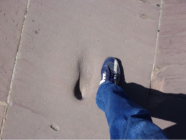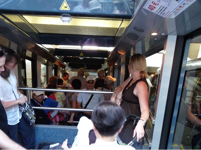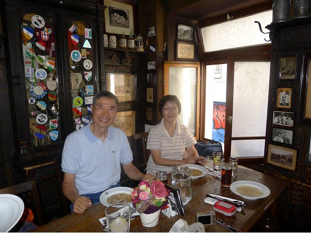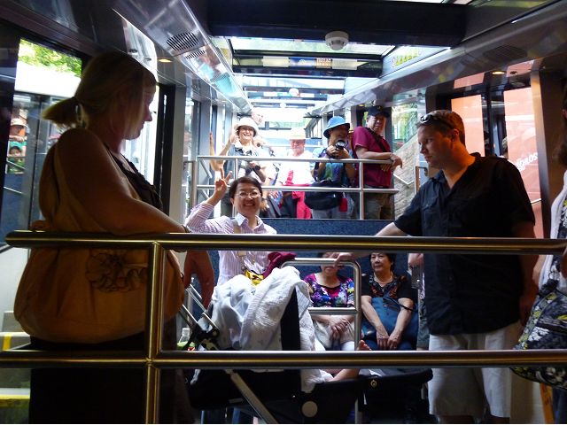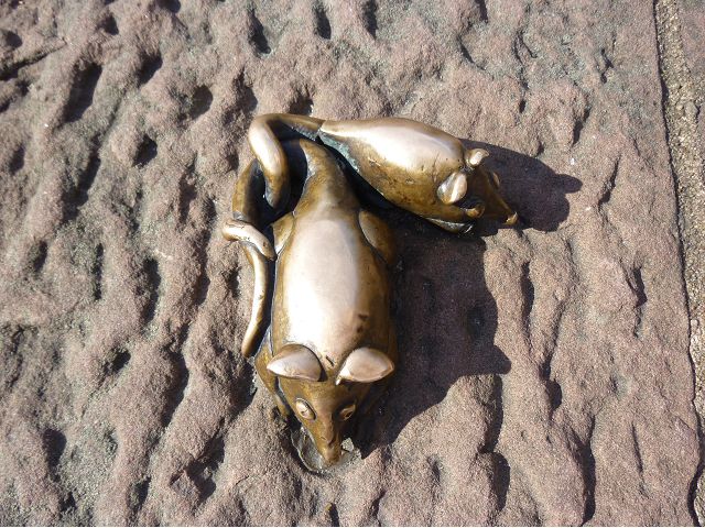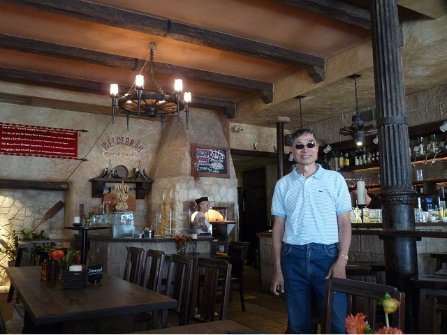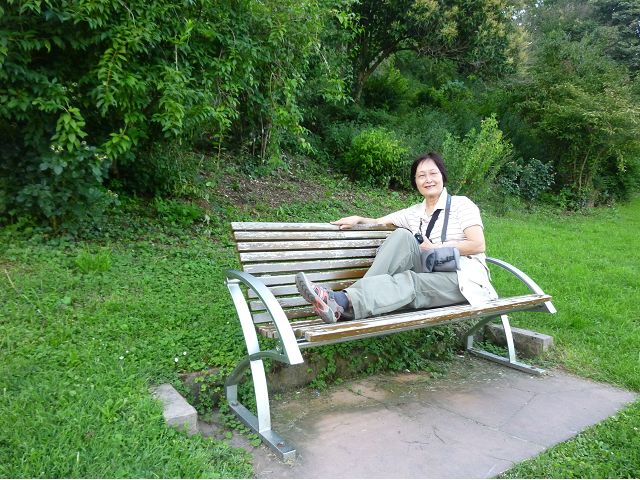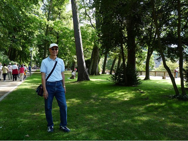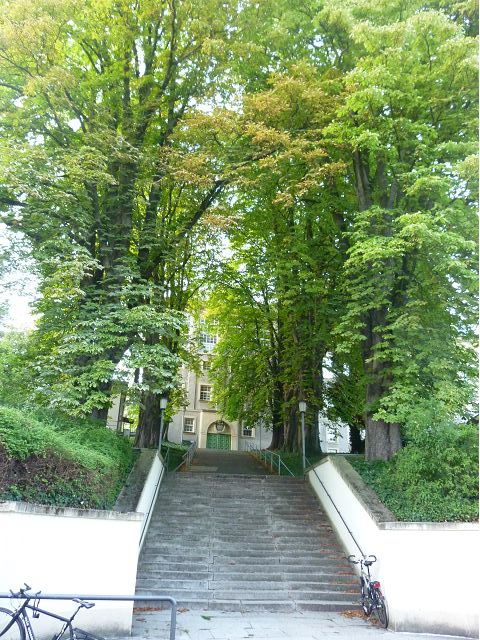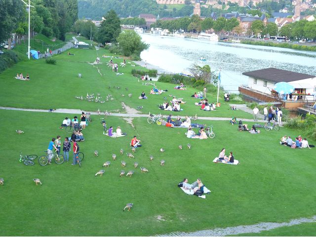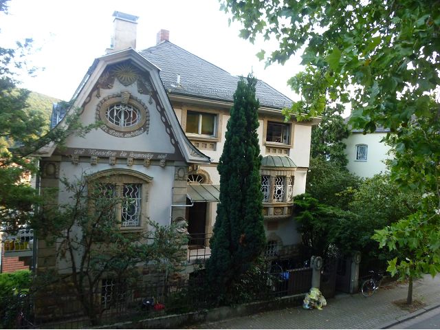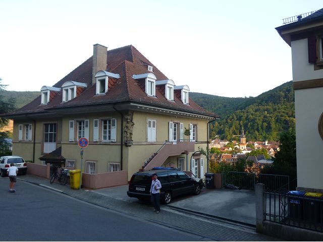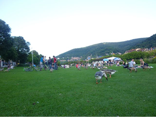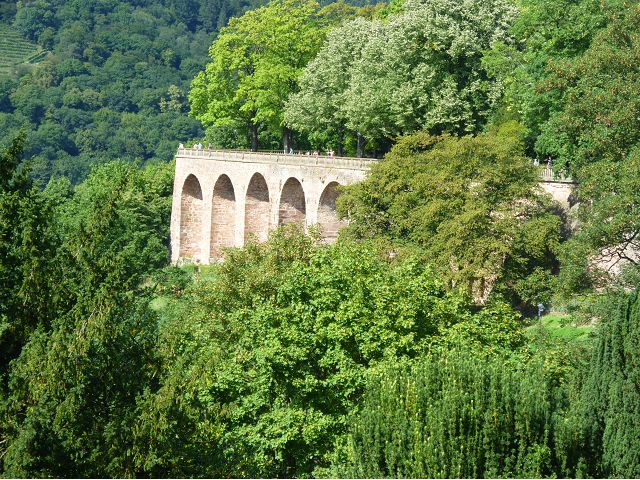 晚餐後,領隊帶領遊覽古橋和哲學家之道(Philosophenweg)。早年,橫跨內卡河的木橋老是被沖毀,選帝侯為解決兩岸交通難題,而於1788年利用沿河岸的砂岩搭建一座長200公尺、寬7公尺石橋,連接老城與河對岸,靠舊城區端蓋有城門,以防止法軍進犯。從舊城區走上老橋,看古橋橋身古樸典雅,9座紅色砂岩拱門優雅橫跨河面,海德堡城堡矗立後方山坡,構成一幅吸引世人的海德堡風景。橋頭兩座白色圓柱狀塔樓高聳,據說原本就是海德堡舊城牆的城門,依舊護衛著老城的入口,古橋目前供行人徒步專用,橋面略見磨損。圓柱狀塔樓城門旁邊一座猿猴銅像(Brückenaffe),稱為"海德堡之猴",是非常討遊客喜歡的地標,遠較橋上選帝侯Elector Karl Theodor及希臘神話女神雅典娜(Pallas Athene)兩座雕像知名多了,緣銅猴左手拿著一面銅鏡,鏡面正對著往來行人,彷彿要讓人從鏡子中看清自我,其旁還有兩隻銅雕小老鼠,傳說碰觸猴子的手指會再來海德堡,摸鏡子會招來財富,摸小老鼠則會多子多孫云,寧可信其有的遊人不少,看,多處銅面都被摸光滑啦。更有趣的是,旁側貼著寫德文的那一面銅版:「Was thustu mich hie angaffen? Hastu nicht gesehen den alten Affen zu Heydelberg. sich dich hin und her. Da findest du wol meines gleichen mehr.」,導遊說,大意是:要刮別人鬍子前,先把自己的鬍子刮乾淨。我們也有類似說法,所見略同,不是嗎?