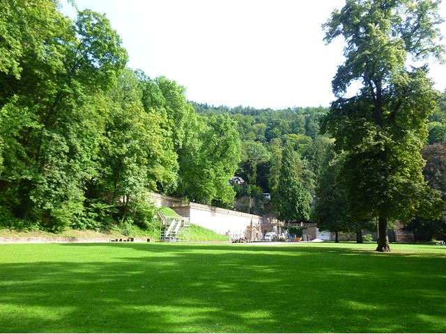 城堡大樓和塔樓之外,就是廣大的城堡花園(Im Schlossgarten,Pfälzischer Garten,Hortus Palatinus)了,裡頭有涅普頓噴泉(Neptunbrunnen) 和多次造訪海德堡的歌德塑像,歌德被認為是德語文學史上最偉大、最具影響力的詩人文學家、哲學家之一,對西方文學、政治及哲學思想產生了深遠的影響。對旅人來說,城堡牆上精緻浮雕、昂立花園的弧形拱門、地窖裡巨大的木製酒桶等,雖經過多次戰火、祝融、甚至雷擊摧殘,歲月滄桑,依然可觀、浪漫動人,但都不如從城堡俯瞰市區,尤其花園南側的貝德露台(Bäderterrasse)或盡頭處的Scheffelterrasse,居高臨下,拍攝城堡及花園、舊城區與古橋的角度極佳,一覽海德堡壯麗景色、舊城區古色古香紅屋瓦、古橋、內卡河蜿蜒漂亮景致,念及其悠久歷史背景、濃烈文化氣息,引發思古幽情,才是海德堡最賞心悅目的迷人風景。