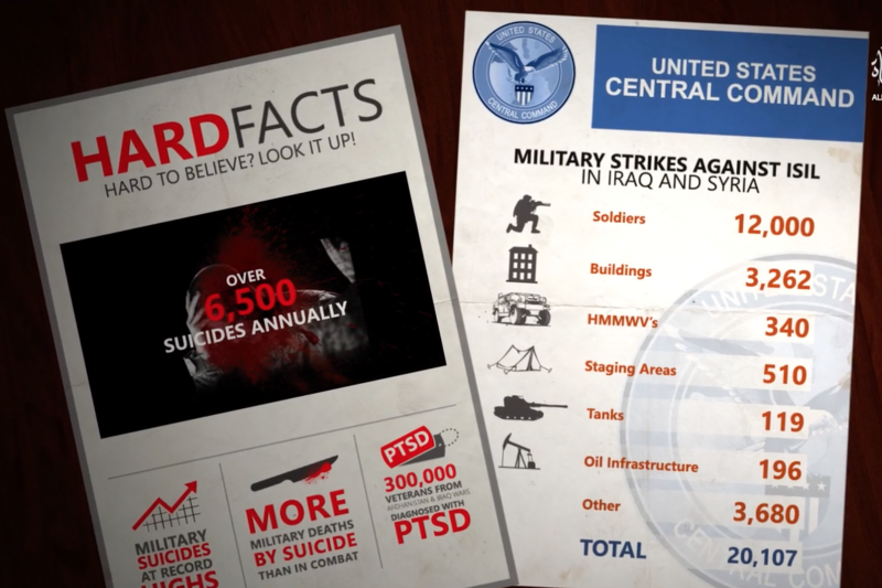 影片中提到美國也許擁有規模龐大的軍隊與精良武器、投注大筆資金,但許多士兵都無法承認作戰的精神壓力,每年都有超過6500人自殺。片中疑似引用美軍中央司令部的報告,表示在對抗伊斯蘭國的戰事中,除了人員裝備損失慘重,每天更有18人無法承受龐大的心理恐懼,選擇自我了斷。。