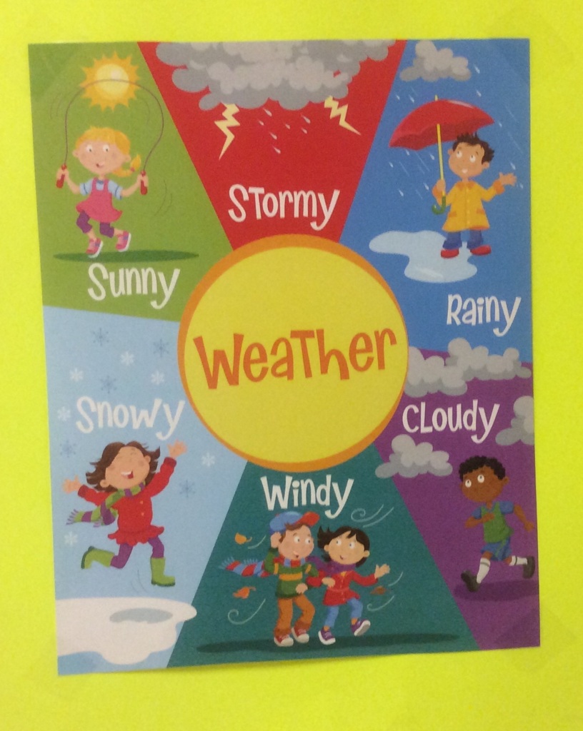 5. weather 1. 天氣[U] 2. 惡劣天氣,暴風雨;自然力[U] 3. 處境,境遇[P1]--- (1) sunny---(2) stormy (3) rainy (4) snowy (5) windy (6) cloudy