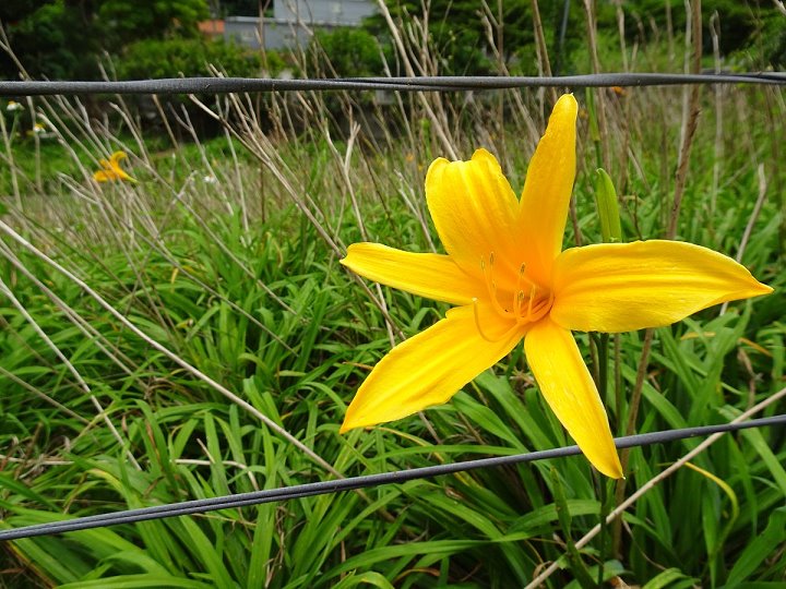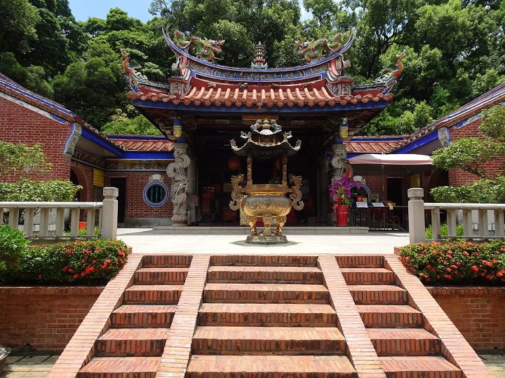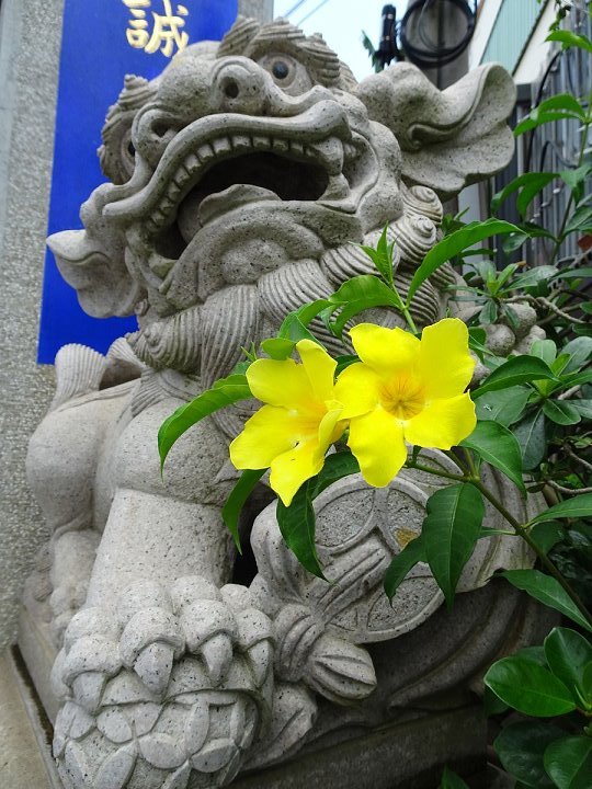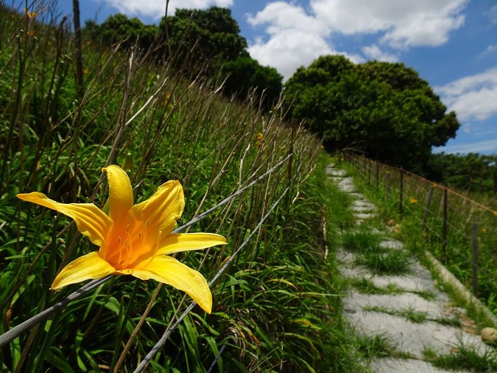 輕掠過虎山巖牌樓,來到觀音廟前,依山而見的三合院廟體建築古樸又安靜。前面有二座門樓,風水牆將三合院圍住,主殿位於正廳,拜殿置於軒亭,看起來沒有大門,內外之分不明顯。這種建築廂房分配,比較特別。庭院樓閣都是古老的味道,安靜漫過整座寺內,慢步其間很是舒服。坐在寺前百年榕樹下,輕風徐來,樹蔭清涼,夏日的悶與熱在這裡一點都發揮不了作用。一旁的金針花季過了二個多月,有些花開得比較久、比較晚,人潮散去,清幽沿著花間小路散落,少了吵雜,多了一份靜心。沿著花田小路而行,陽光異常熾熱,橙色花朵開得特別嬌艷,尤其在一片已經落幕的繁花似錦後,吵雜與擁擠已經是明年的事,今年虎山巖又歸於平靜。