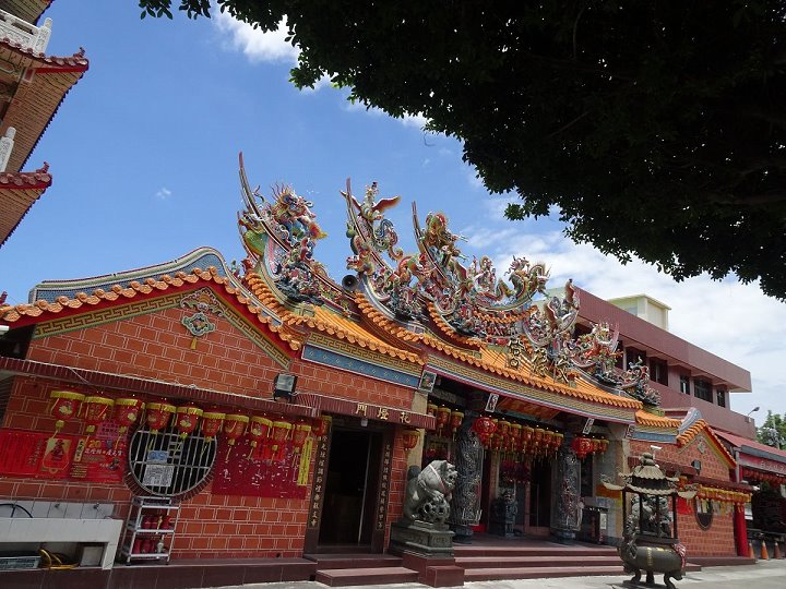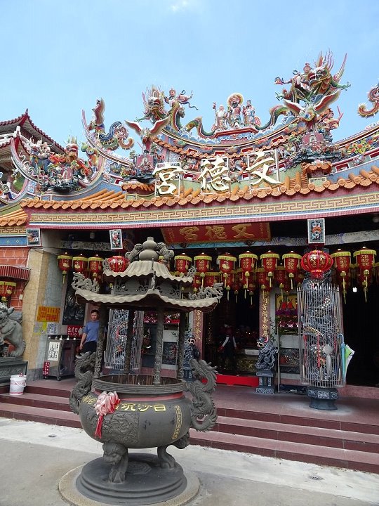 虎山巖附近是虎山仔地區,山下還有一間白沙坑文德宮。離開觀音廟下山,來到土地公溪畔,順便到文德宮坐坐,廟前同樣有一棵大榕樹,樹下視野擁抱主殿和五營樓。坐在樹下乘涼,新麗的三川殿、高聳的五營樓,堆疊著白沙坑文德宮的故事。附近村里都以文德宮為信仰中心,每年元宵前後舉辦排燈繞境,熱鬧非凡。來到花壇,走進古老的廟宇,讀一些地方上的故事,其實是很有趣的事情,也是認識在地的好方法。