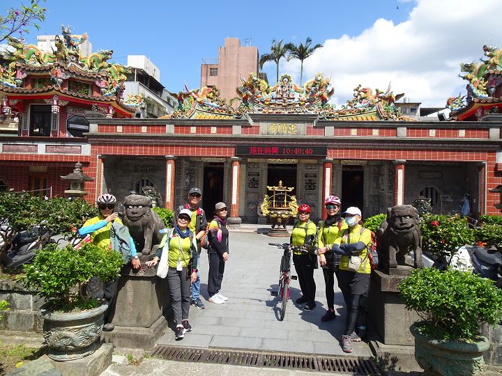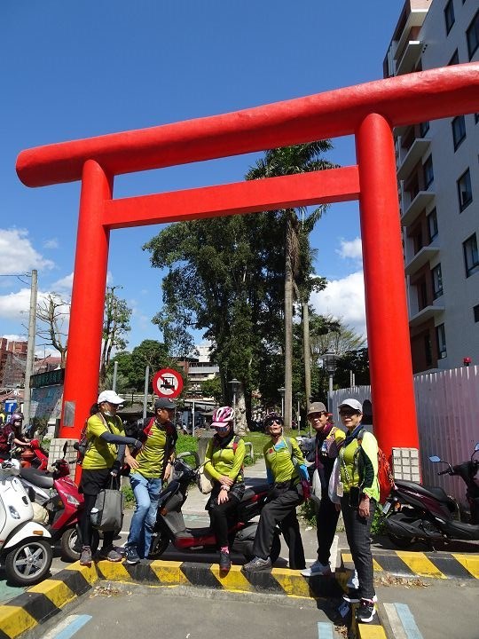 隨後,我們來到汐止神社遺址。紅色的鳥居依舊立在原地,像是一座無聲的大門,通往過去的記憶。雖然神社已不復存在,但空間的靈魂仍然留著。現在的忠順廟,供奉著保儀大夫,曾經歷改朝換代與被迫遷移,最後終究是回到了蘇家大院的原址。看著同學們推著車、靜靜穿過鳥居,這種移動不再只是前進,而是一種與歷史短暫交會的過程。