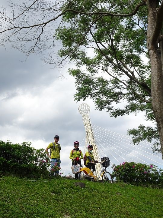 沿著鐵路高架橋下,步行大約五分鐘,我們來到了「茄冬腳鐵道公園」。清代建橋的基礎依舊堅實地立在土裡,雖然列車早已遠去,但那種沉穩的歷史厚度,與一旁現代馬路上來來往往的車流形成強烈對比。騎車如果只是快速經過,這些細節很容易被抹平為背景;但當速度慢下來,眼前的一切就會出現歲月留下的層次感。