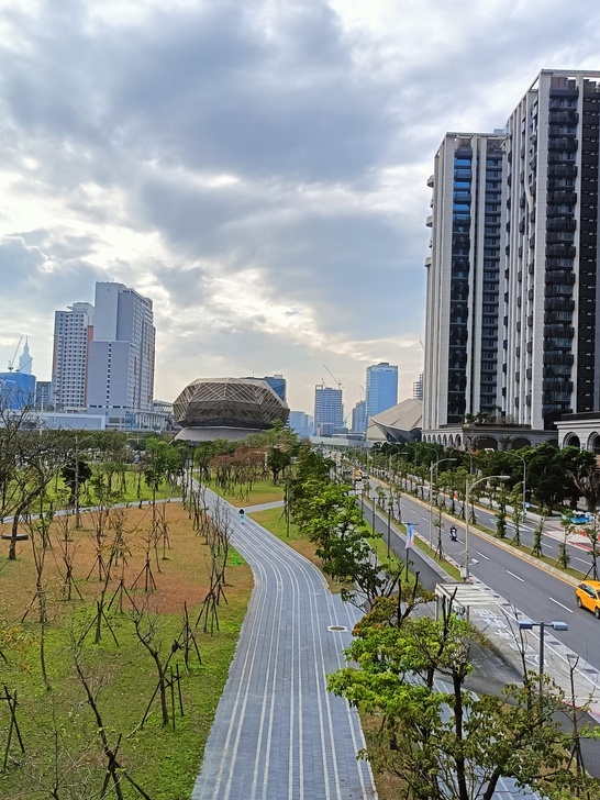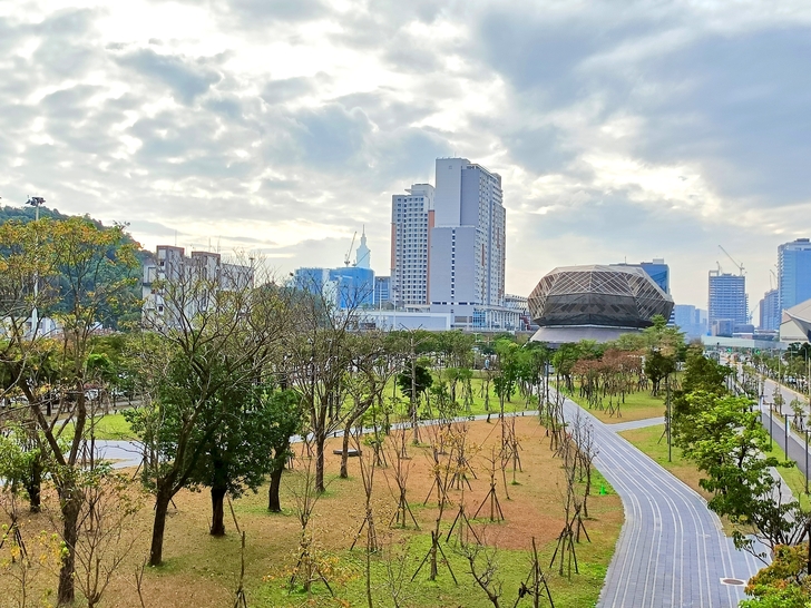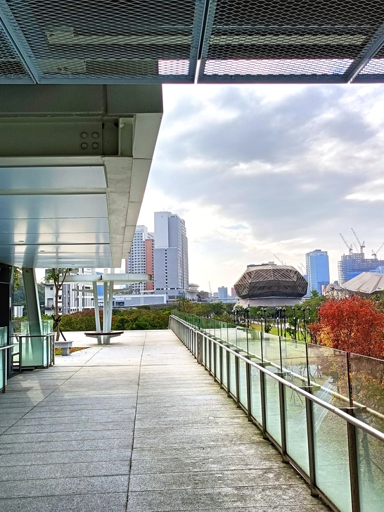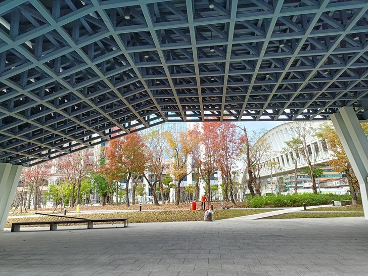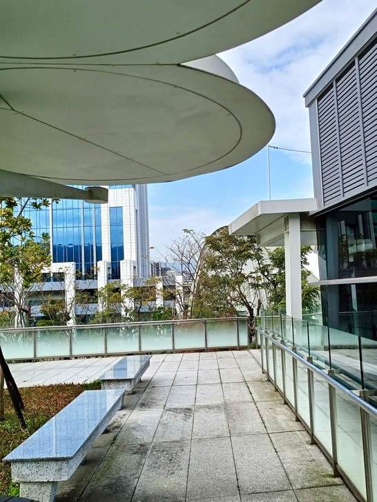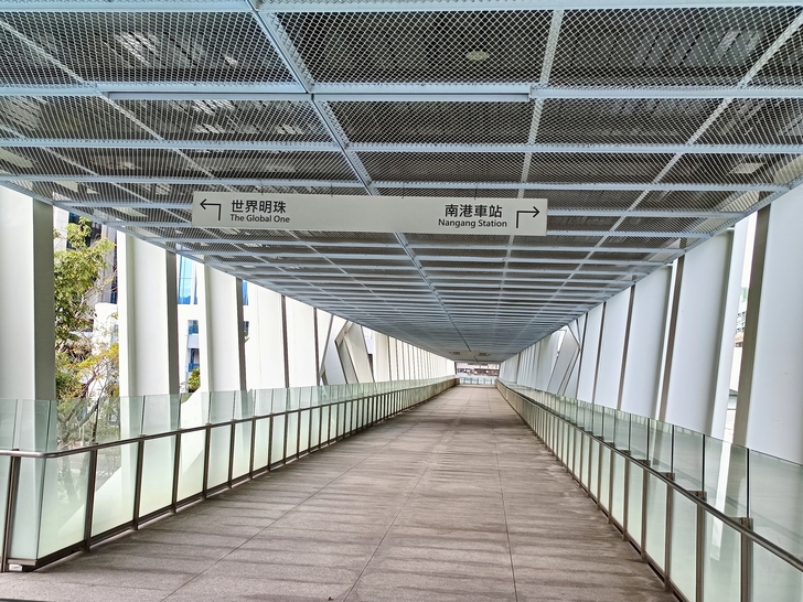綠地廣場上的人行空橋 不見人影 但已開放通行