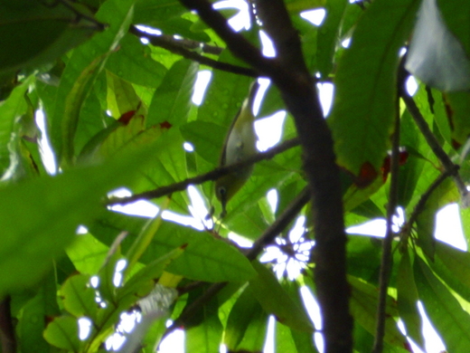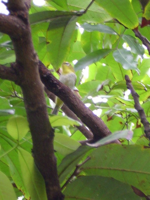 週日早上,玫伶正要爬上秘密基地時,突然大叫:「你們快來看!」家人們以為她摔傷了,連忙趕到樹下。「你們看,那是〝綠繡眼〞耶!」順著她手指的方向去找,眾人果然有所發現,不斷驚呼:「好漂亮!好可愛喔!」只見一隻綠精靈,以樹葉為保護色,忽上忽下,不停跳躍。我想拍下牠的身姿做紀念,但量販店買的2990元特價相機,卻追不上綠精靈的靈活;所幸,妹婿仗著180的身高,採取守株待〝鳥〞的策略,終於成功拍下綠精靈的倩影,還找到牠的窩,窩裡還有一顆蛋。
