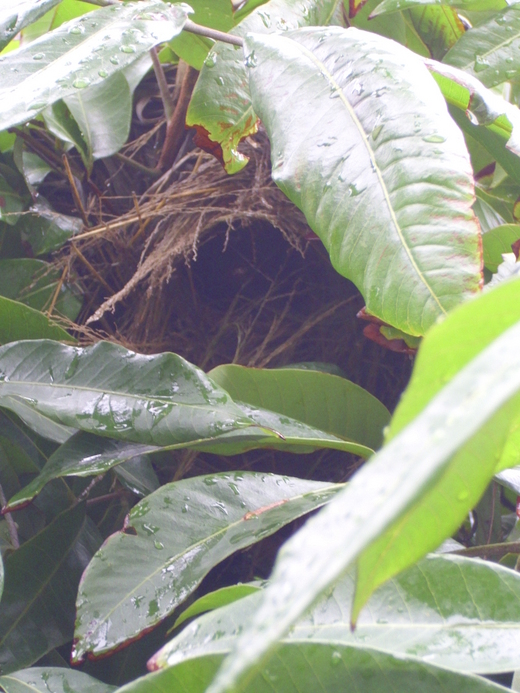 有樹木就容易吸引鳥類來住,去年採收龍眼時,就發現一個廢棄的麻雀窩。由於這兩棵樹都不高,附近的流浪貓也常來樹下乘涼,有時還會爬到樹上覓食;有一次我就親眼目睹野貓上樹咬了一隻還不太會飛的幼鳥,當我用石頭趕走野貓後,那隻幼鳥早已氣絕。也許,這個廢棄的鳥窩就是因為野貓的攻擊而殘破的!