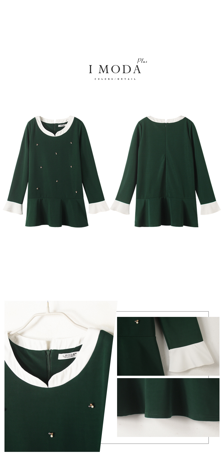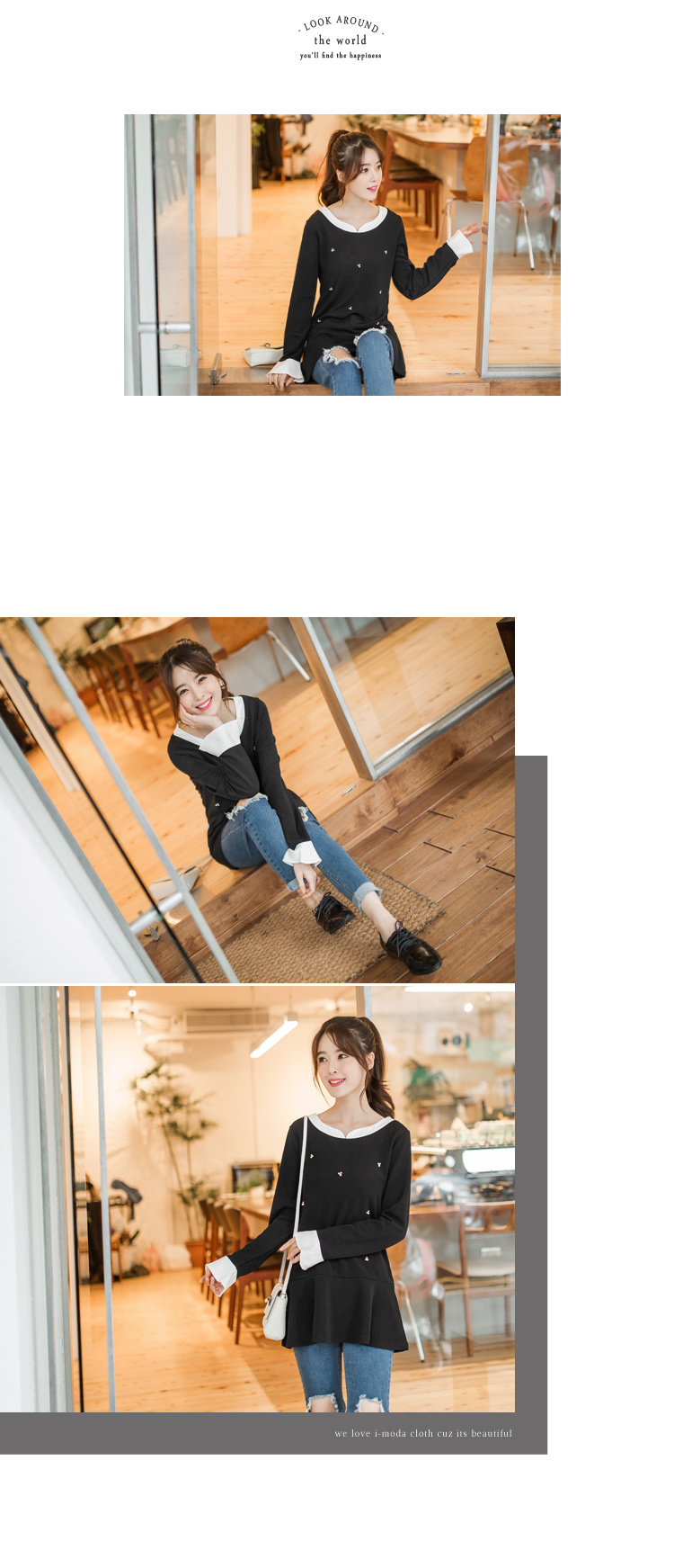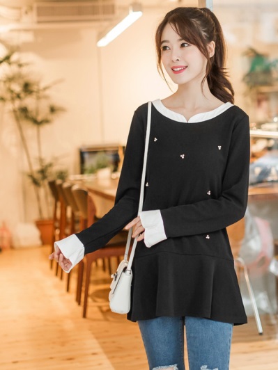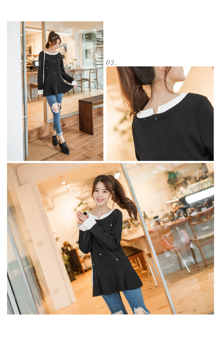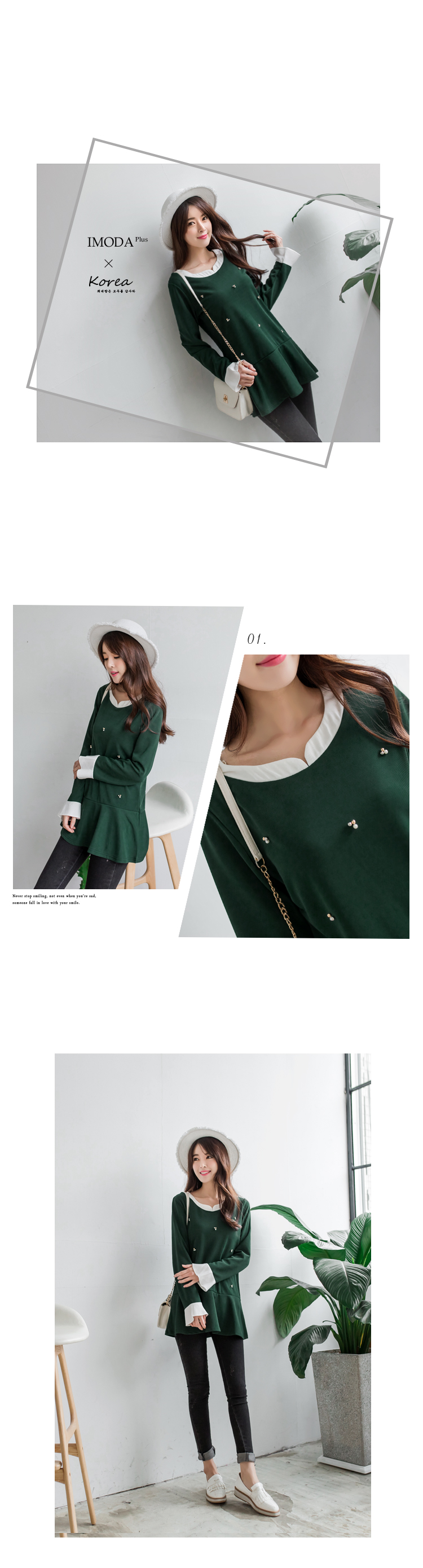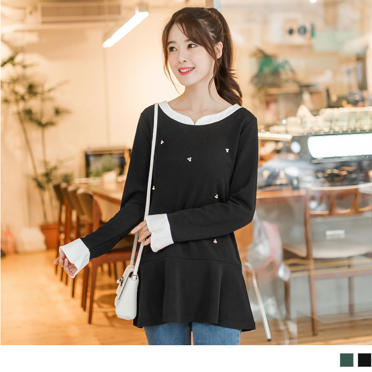 配色珠飾點綴造型拼接荷葉袖傘襬雪紡長版上衣.2色Ptt及Dcard推薦的人多嗎