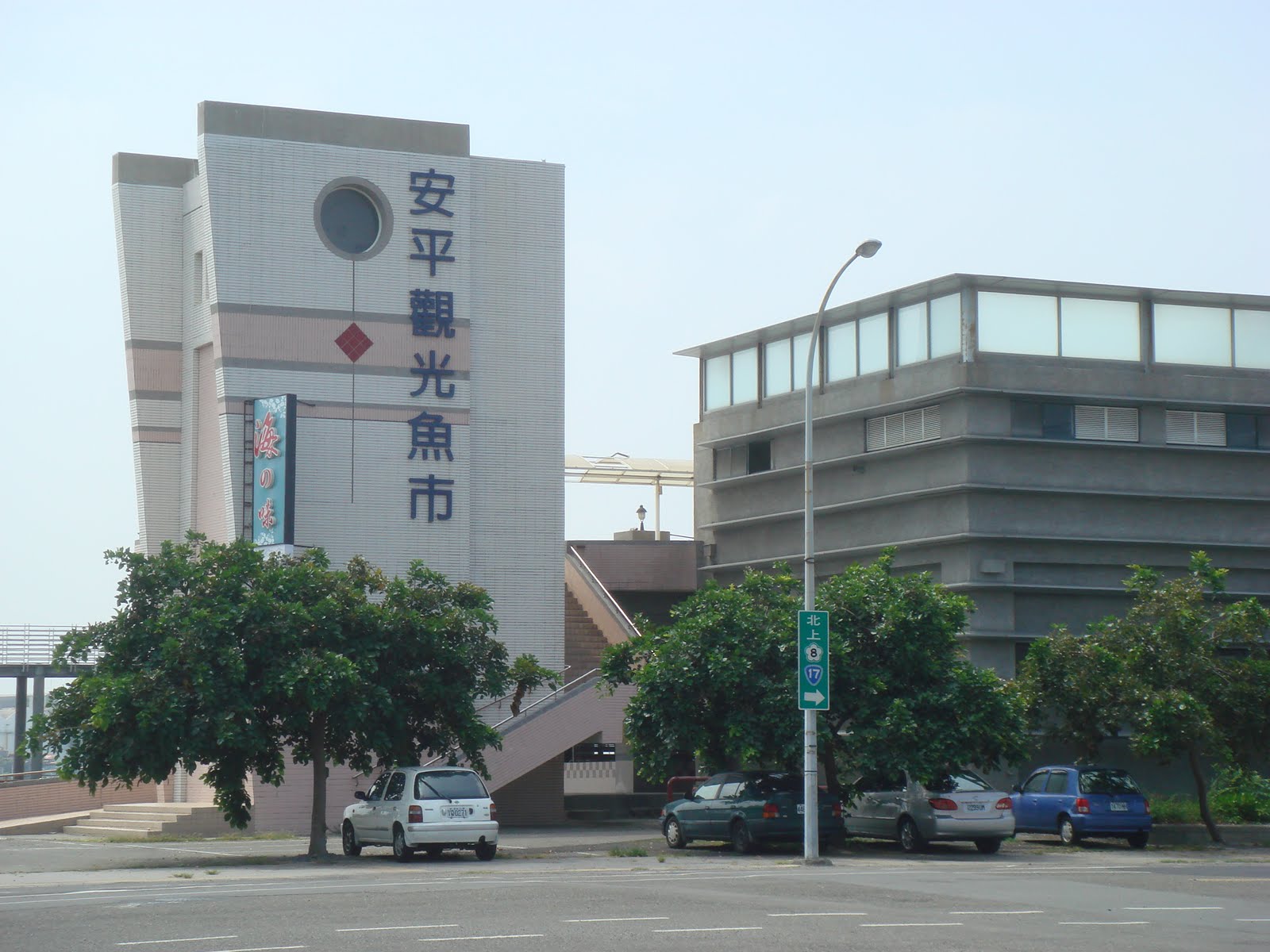 由漁光島上端遠眺安平新港和觀光魚市,新安平港邊的觀光魚市挪大的建築則成了蚊子館