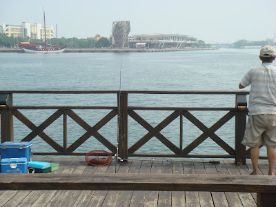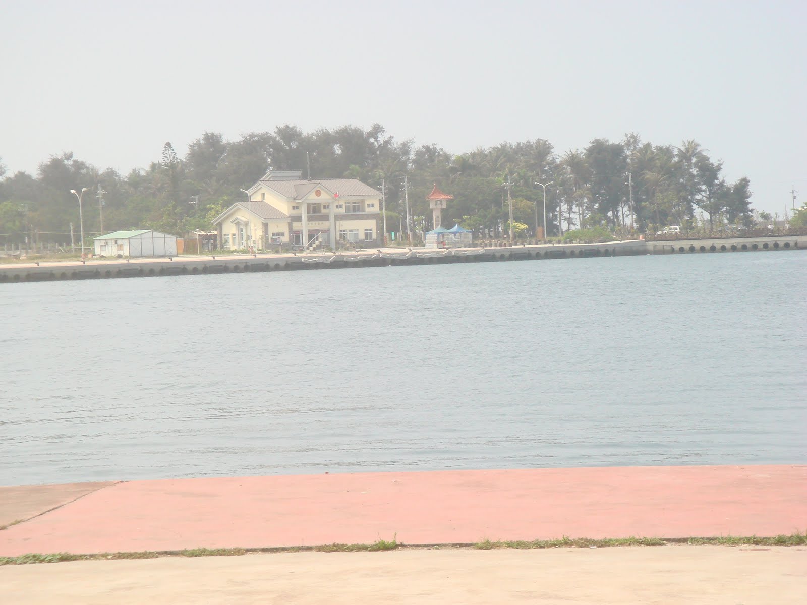 由安平新港看對岸漁光島最上端的海巡署辦公室和秋茂園牌樓。港建好之後就這樣一直空蕩蕩的