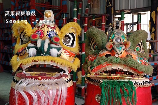 傳統的獅頭是以桂竹或藤所編成的骨架,再用宣紙4層加絹布或紗布,一層層黏貼而成粗胚,接著上色、噴漆、風乾,然後黏上獅毛,大約要花上一個月才能完成。獅頭大小大致分6種,依年紀來使用,即使幼稚園小朋友也可以在訓練後上場表演。獅頭底色則分為5種,每一種顏色代表一位三國演義中的人物,例如:金色是劉備、紅色是關羽、黑色是張飛、綠色是趙子龍、黃色是黃忠。在獅毛方面,俏皮的馬來獅多用長而軟的狐狸毛,而顯得較凶惡的佛山獅則採用蓬鬆的棉羊毛來表現。