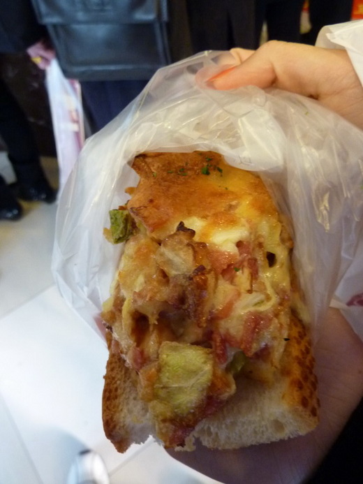 除了珍珠紅豆奶茶,她還買了一片名為「凱薩大帝」的麵包。說實在,我覺得這是誇張了,簡單來說就是類似披薩的麵包,上面鋪滿各種素材,一口咬下卻有點硬,若非熱騰騰的珍珠紅豆奶茶伴隨在側,她應該吃不了幾口。