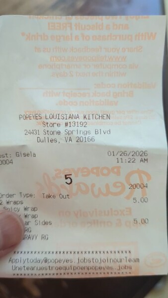 拿著老大給我的Popeyes收據