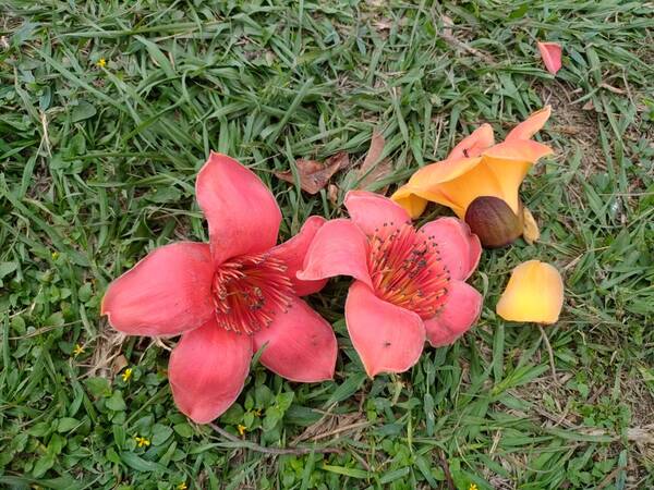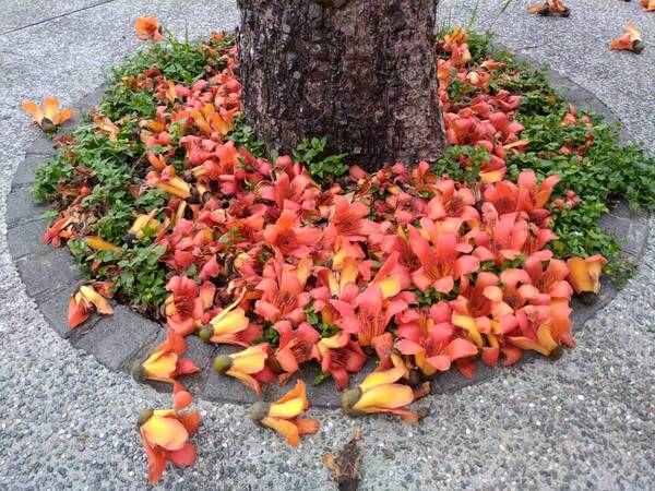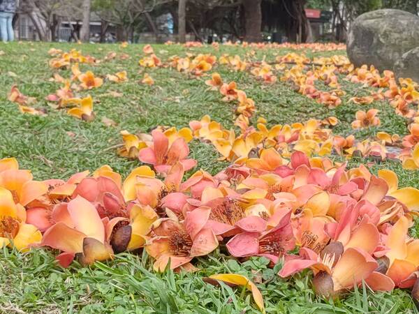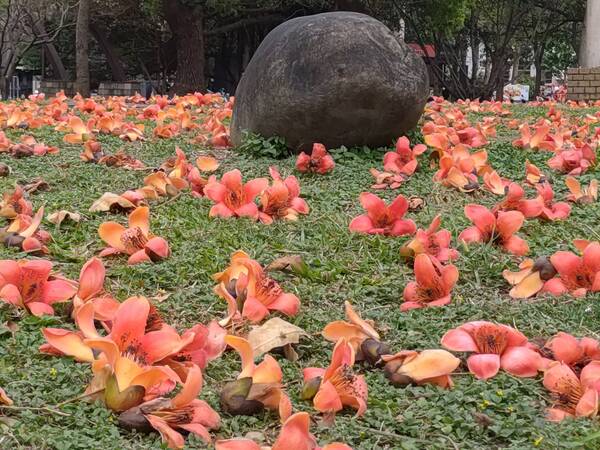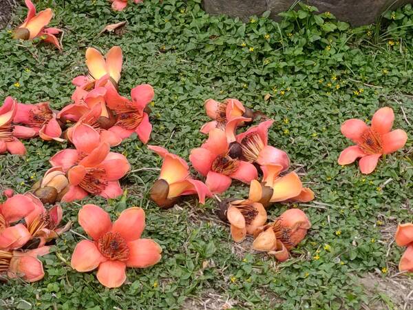 三月開始盛開的橙紅色厚實的木棉花,高掛在樹上,鳥兒飛到枝頭上來啄食,幾天之後風光之後,鮮紅的花朵就開始墜落,落花圍繞在樹的根部附近,那種義無反顧的姿態讓人稱它為英雄花。 2026年3-4月攝於新竹