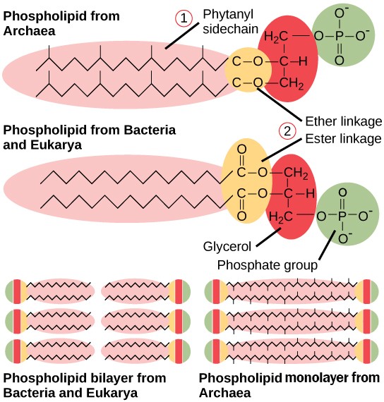 圖2-3摘自Opentax for AP課程生物學的圖22.15 古菌磷脂與細菌和真核生物的磷脂有幾個不同之處。首先,它們的植烷基側鏈是支鏈的,而不是線性的。其次,脂質與甘油之間是透過醚鍵而不是酯鍵連接的。第三,古菌的磷脂是單層結構;而細菌和真核生物的磷脂則是雙層的。