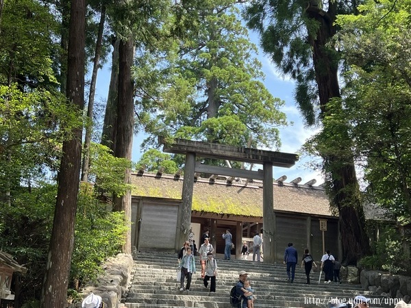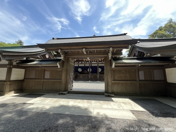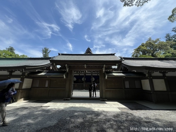 內宮祭祀天照大御神,正殿建築樣式跟外宮正殿是相同的,稱為「唯一神明造」,其他神社建築是不能使用這種樣式來建造。保存著象徵日本皇權三神器之一的八咫鏡(天孫降臨的傳說中從天界高天原帶至人間) ,天照大神是日本神話中最高位的神祇,神道教的信仰中心,同時也是日本皇室的祖先,是在伊耶那岐從黃泉國歸來後,行禊清洗左眼時誕生的。階梯上去後就不能拍照,一般參拜者只能到最外面的外御垣南御門前參拜。