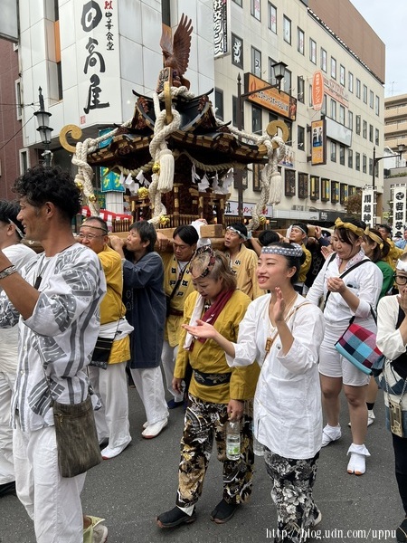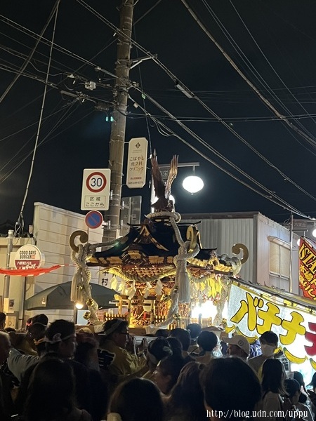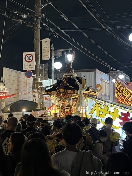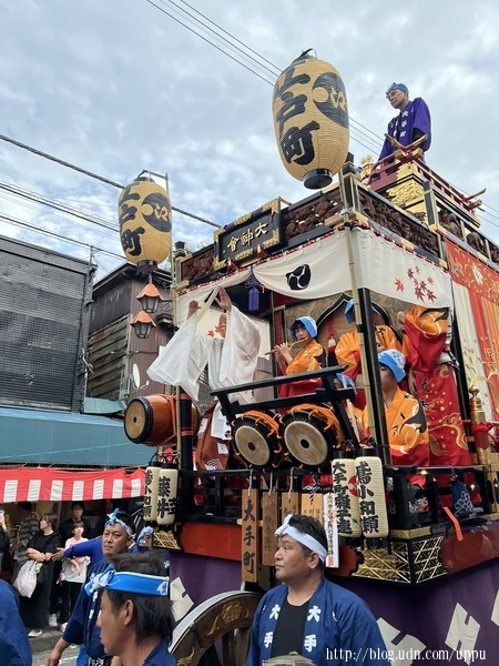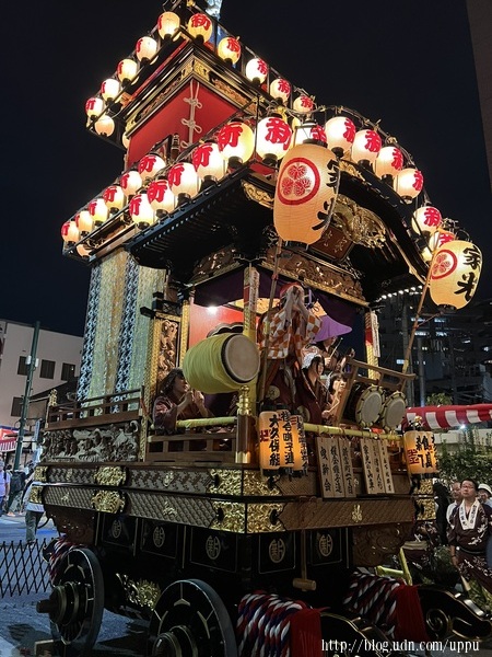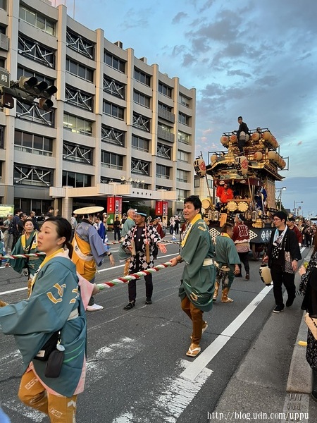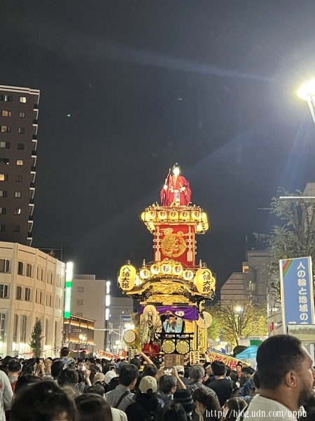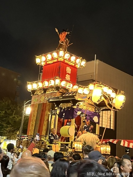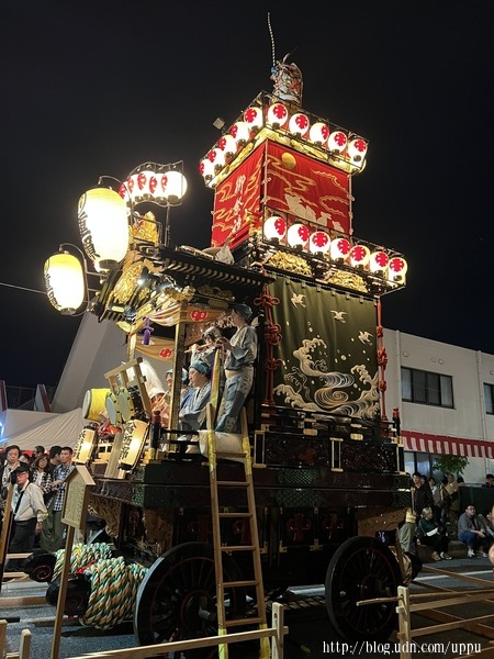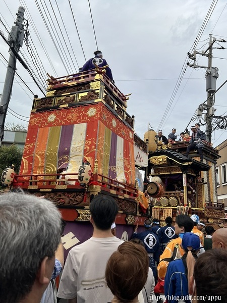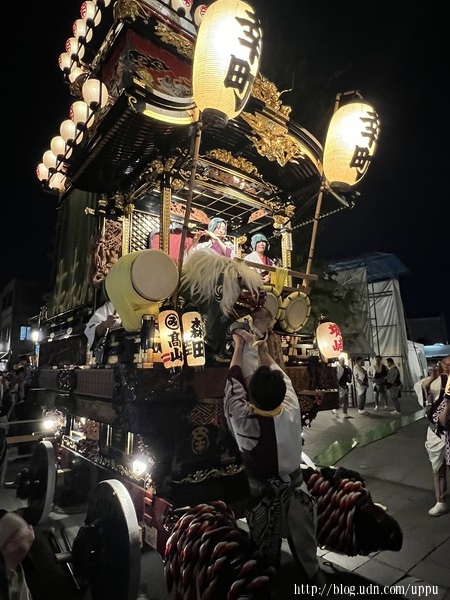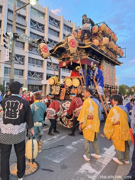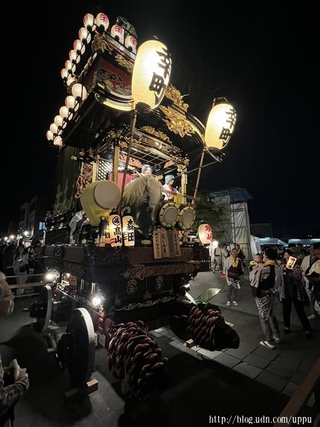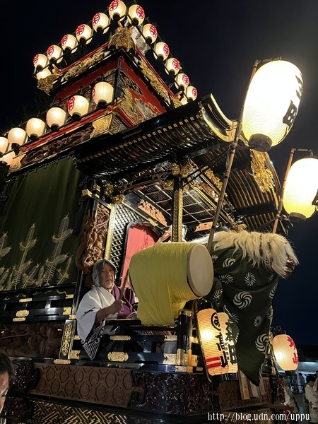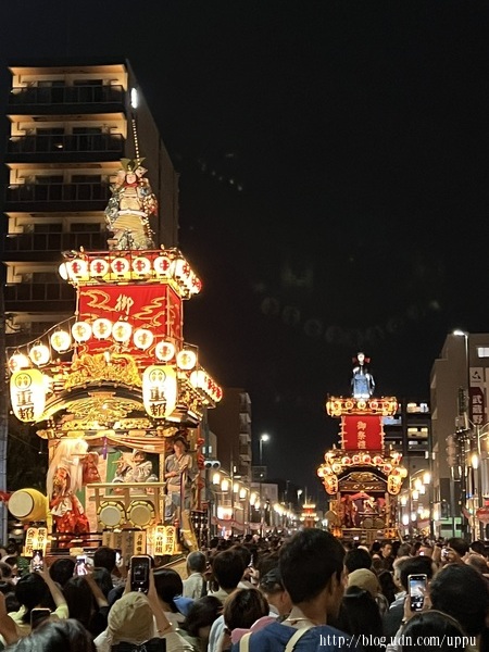 相遇的多輛彩車,會以伴奏(笛子、鼓、鉦、跳舞)來競賽,參加祭典的人高舉並搖著燈籠和喊出歡呼聲。