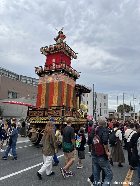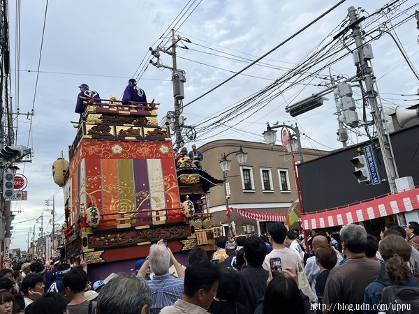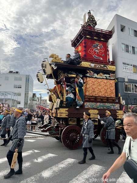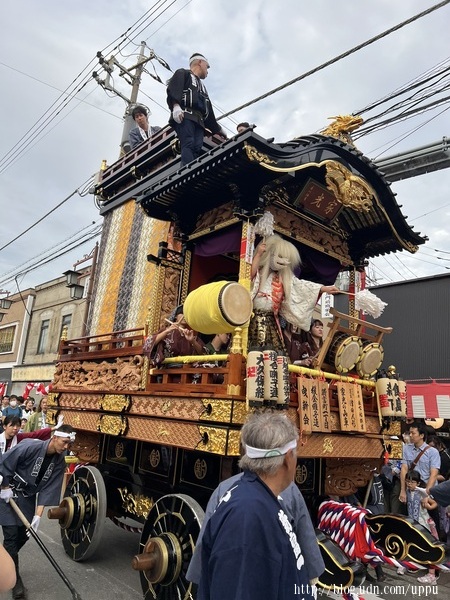 高達8公尺的彩車上層,乘載著以能劇、雅樂、神話、歷史人物等題材製作的人偶。江戶時代後期製造的人偶至今仍正在服役中。乘載人偶的台座使用了黑色與紅色的漆以及金箔,帷幕則是依據人偶的特色採用了鮮豔的刺繡。高達8公尺的彩車上層,乘載著以能劇、雅樂、神話、歷史人物等題材製作的人偶。江戶時代後期製造的人偶至今仍正在服役中。乘載人偶的台座使用了黑色與紅色的漆以及金箔,帷幕則是依據人偶的特色採用了鮮豔的刺繡