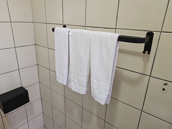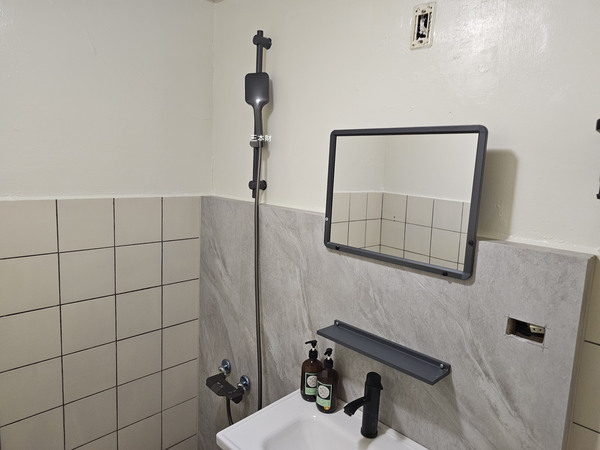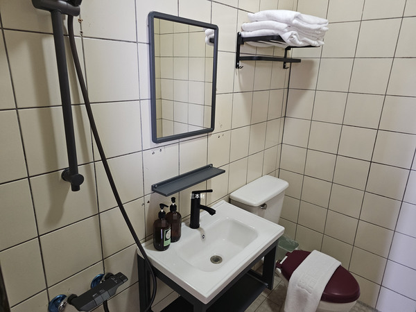 淋浴區、照妖鏡、洗臉台、座式馬桶、浴巾