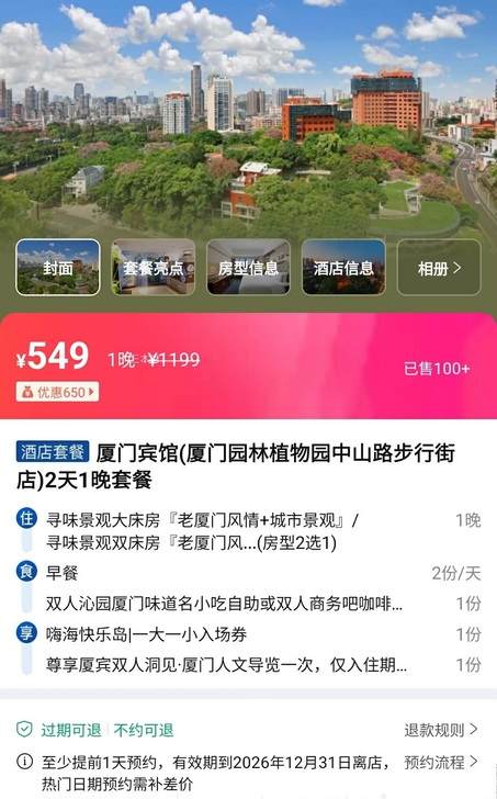 這回跟好友入住廈門賓館的次要原因是上門吃閩南小吃Buffet自助餐,因此我們選擇購買飯店一泊二食的優惠套餐,房價一晚549塊人民幣(折合台幣大約2566.58元)包含:不分平、假日尋味景觀大床房或雙床房+2份自助早餐+雙人閩南小吃自助午餐或雙人商務吧+嗨嗨快樂島入場券+廈門賓館人文導覽,扣除飯店的成人早餐每位70塊人民幣、閩式自助午餐每位108塊人民幣之後非常划算,套餐有效期限至2026年12月31日止...