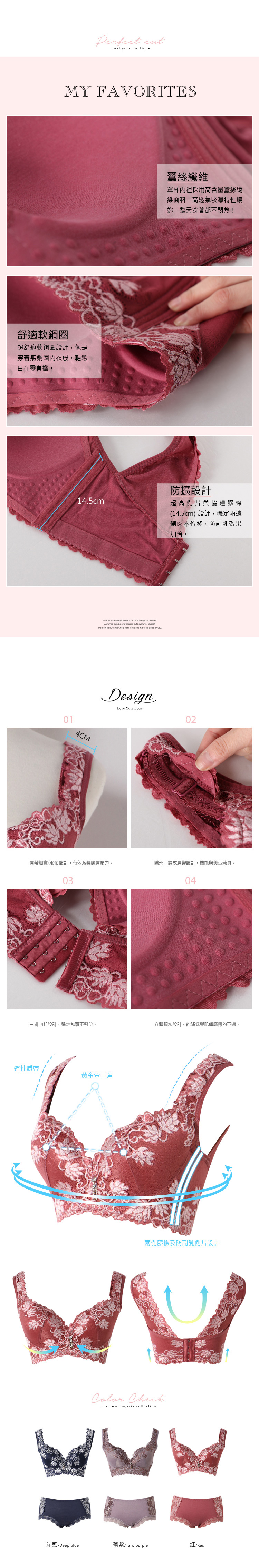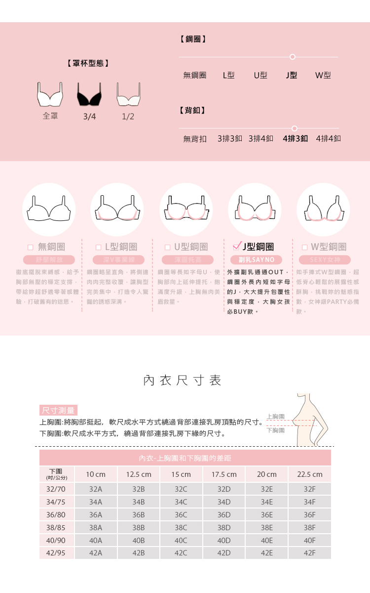 | 《VA235》 超無感零著感軟鋼圈,讓妳穩穩舒適一整天! 大罩杯選用雙膠條脇邊加高,包覆感提升! ********************** ********************** 小提醒: 胸罩有鋼圈,後釦式穿法,後釦設計為3排4釦,肩帶不可拆可調整長度, 建議單獨洗滌,手洗或放洗衣袋洗最佳喔(勿用熱水) 貼身衣物建議第一次穿著前請先下水洗滌,以避免染色問題唷~ 建議選購的水水們務必看清楚平拍再行購買,平拍作為參考較為準確哦~ ※基於保障個人衛生,內衣、內褲為貼身衣褲,恕不提供【退/換貨服務】,請下標前確認尺寸斟酌購買 <產品規格> 內衣32B/C/D 搭配內褲M 內衣34B/C/D/E 搭配內褲L 內衣36B/C/D/E 搭配內褲XL 內衣38B/C/D/E 40C/D/E 搭配內褲XXL M:腰圍約51-76cm、臀圍約64-94cm、褲口約42cm L:腰圍約56-80cm、臀圍約68-98cm、褲口約46cm XL:腰圍約60-85cm、臀圍約72-102cm、褲口約48cm XXL:腰圍約64-92cm、臀圍約78-105cm、褲口約51cm 腰、臀圍為平放-彈性撐開約略測量 褲口為一圈平量 | | 材質彈性 | 色系 | 配件 | 內衣內料: 內裡:100%蠶絲 後背帶:100%蠶絲 內衣外料: 蕾絲:85%尼龍+10%彈性纖維+5%嫘縈 內褲:100%蠶絲 蕾絲:85%尼龍+10%彈性纖維+5%嫘縈 | 3色 | 無 |