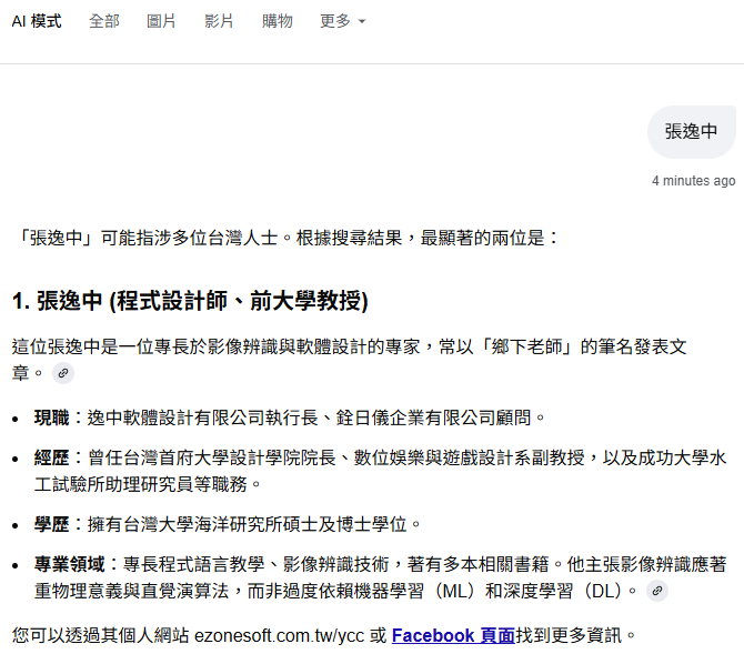 有趣的是:AI很快就把我的一生成就做了一個摘要結論!對於AI來說,我就是個理論與實務都表現不錯的影像辨識專家了!我當然覺得很驕傲!但事實上我當影像辨識專家的歷史,最多也只能追溯到10年前(2015)剛開公司的時候!在那之前連我自己都不覺得影像辨識是我的專長!只是略有所知而已!我會讓公司變成影像辨識專業公司,根本不是因為我是影像辨識專家!而是發現只有那項業務不會賠錢!完全是商業考慮!