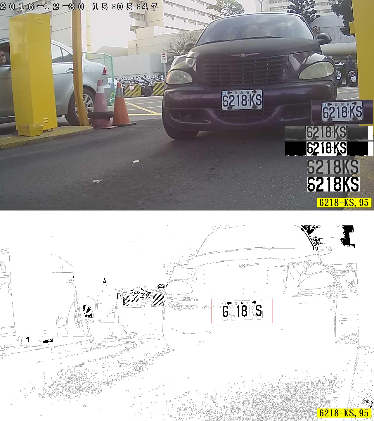 所以我們是用可能不完整的幾個車牌字元來鎖定車牌位置而已!由這些可能不完整的資訊切割出可能已經變形的車牌區域,再研究此區域的變形程度資訊,加以校正成正視不歪斜的影像!之後才是在此區內做第二次的字元目標切割與辨識,最終辨識出正確不缺字的車牌!
