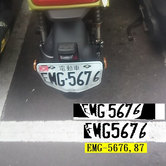 我得到的兩個敗部冠軍字元就分別是前面的E與後面的6了!以台灣的七碼車牌來說,E是很常見的電動車車號,所以我就依據經驗法則,讓它加分過關了!6字也是以降低錄取分數的方式,讓它可以以低標錄取了!這樣就在合乎法規格式與經驗法則的機率統計前提下,我猜測了一個非常合理,正確機率很高的答案EMG-5676!也完全符合所有人會做的目視判斷!