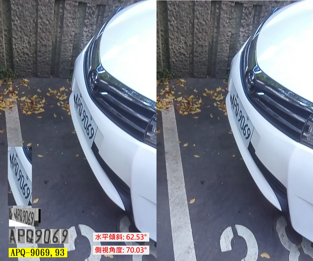 很顯然的,我的第一名優勢就是如上案例呈現的高角度變形車牌的辨識能力了!這些年我當然也會持續關注競爭對手的研發進度,如上圖例呈現的有兩個技術關鍵:一個是車牌的側向斜視角度,一個是車牌的水平傾斜角度!我發現側視角度的辨識能力其他廠商都進化了,我的優勢不明顯了!但是高水平傾斜角度的辨識能力我還是遙遙領先的!