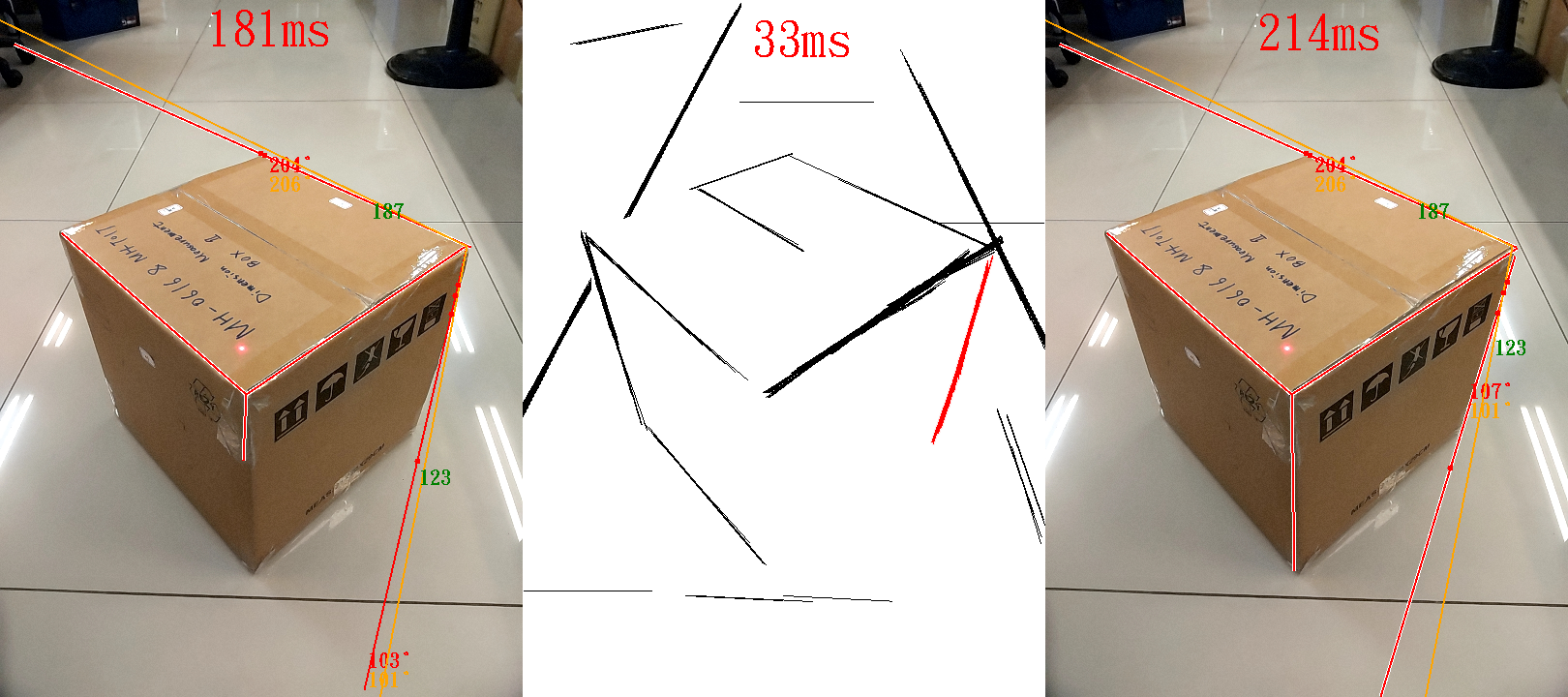 以上圖來說,所謂明顯的長直線段,就是箱子的三個軸線與六個邊線中較明顯的幾條線,加上地板磁磚的交界處產生的直線了!上圖中就是我獨立開發出來的,快速找出長直線段的成果了!如果我的RD開發的基礎演算法出錯的線段(如上例),剛好是我的長直線段程式有找到目標的那條線,那我的第一印象辨識結果就可以適時糾正這個因為演算法「想太多」而產生的錯誤了!