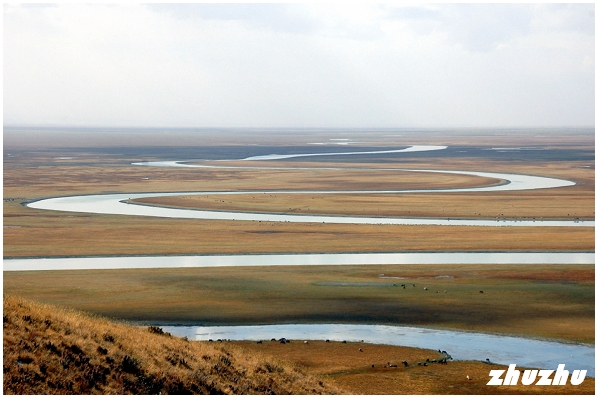 為了方便觀景及拍照,現在這裏已經建成一個大的觀景平臺和階梯;遊客可以站在平臺上欣賞日落,也可以沿階梯下到山坡下,近距離欣賞九曲十八彎。來到最佳拍攝九曲十八彎的觀景台,雖然要耗些體力,但為了登高欣賞美麗的景致,我當下就努力的往上登爬!移步換景,周邊的景色果然讓我受寵若驚-下面遼闊的草坪,大片的濕地展現在我的眼前,曲折蜿蜒的河流就像揮灑的草書,大寫著美字;令人欣喜的是可以遠遠的看到各種禽鳥,在水中遊弋,在天上淺淺的飛翔。
