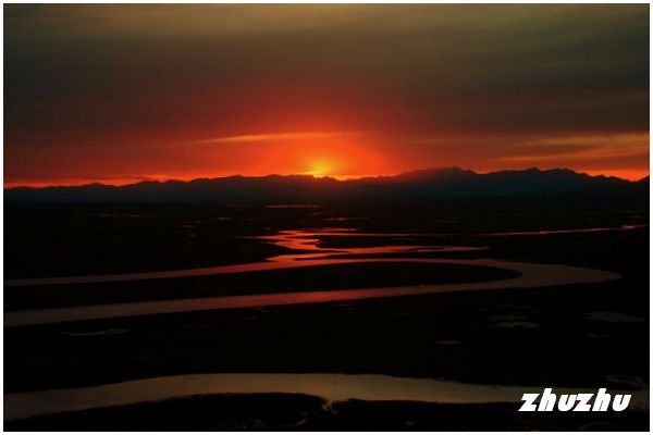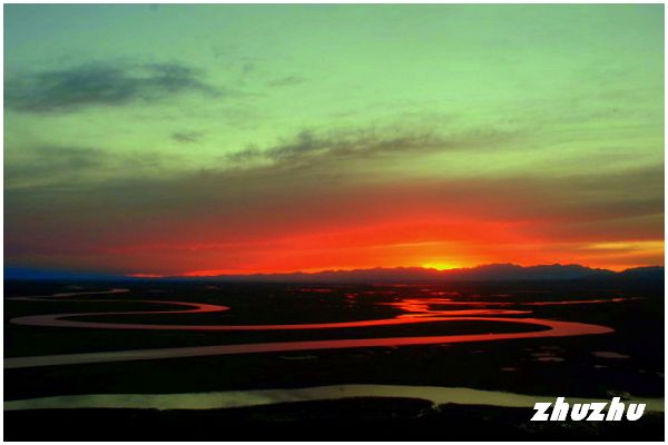 運氣來了,陰轉晴,當太陽沉入天地交接處時,陽光再度轉為紅色,九曲河流在周邊漸暗天色的襯托下變得更為晶瑩,如同一條閃光玉帶蜿蜒于巴音草原上。隨著太陽在地平線下的繼續下落,天邊的雲彩漸漸變紅,太陽把雲朵鑲上了紅色金邊,那色彩越來越濃,這不是令多少攝影人癡迷的火燒雲嗎?景色越來越壯麗,九曲十八彎的水被染成層層紅色,那紅色逶迤遠去,流向天邊,一直看不到邊際。