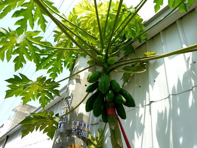 你(妳)必須刻意停下腳步抬頭望著「木瓜」,在其週遭掃視一下...便能找到木瓜花的芳蹤。
