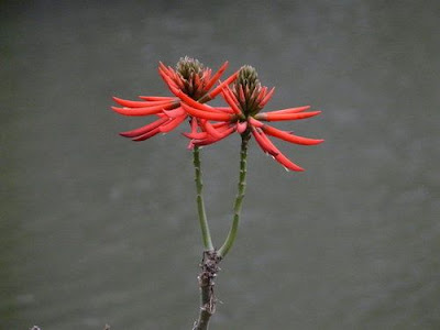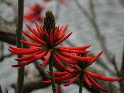 花形:總狀花序,頂生,小花緊密排列於花軸上,花冠朱紅色,蝶形花旗瓣近管狀似象牙,向四面下垂,整個花形好似一把熊熊火炬,花姿明艷,盛開於落葉之後。