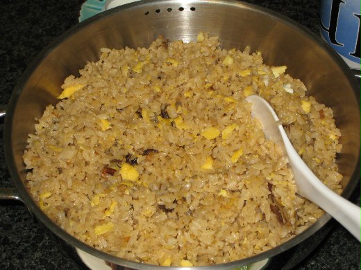 晚餐時,我跟台客說,我覺得阿基師的炒飯應該是放很多油,所以他炒的蛋和飯都會油油亮亮而且鬆軟,我的炒飯因為沒有放很多油所以雖然粒粒分明但是沒有油油亮亮,還有最重要的一點,也許因為沒有放很多油,所以蛋和飯都有一些黏鍋底,所以我花了很大的力氣刷我的炒鍋,而我認為大廚們作菜時多放些油除了美味之外也可節省他們刷洗鍋子的時間和力氣