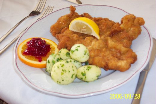 奧地利炸豬排,我覺得so so,沒有我媽炸的豬排好吃,也沒有台灣隨處可買的協力香雞排好吃,歐美地區的肉類因為屠宰時沒放血,所以肉質風味跟台灣本地的肉類風味口感差很多,老外基於人道立場及飲食習慣,所以在屠宰時沒有放血,台灣因為動物血有市場(豬血、鴨血都是日常料理小吃)所以屠宰時有放血,說真的,屠宰放血對動物是很殘忍,可是說真的,經過放血的肉類,因為化學變化,所以口感風味都比較好,說穿了,台灣的東西還是比較好吃啦