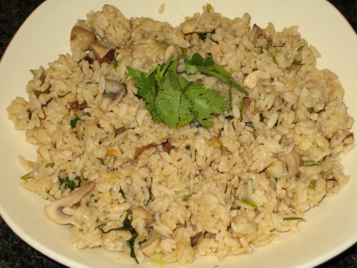 然後把洋菇(先用熱水燙過)、蒜頭等等家裡找的到的東西通通下鍋去爆香,等飯煮好之後,一起拌炒,最後加鹽調味、加上香菜,就是一道幸福的台式野菇炒飯