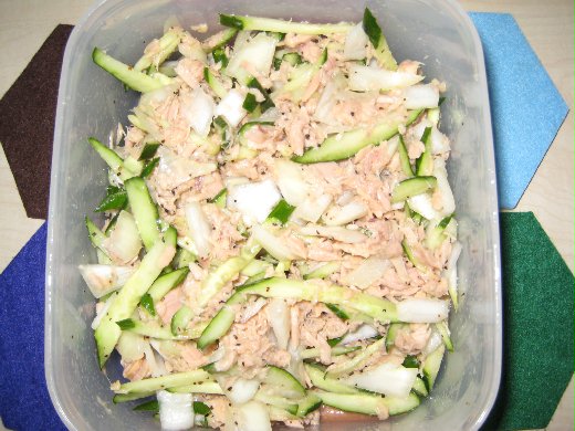 很隨性的切完洋蔥及小黃瓜之後,就和鮪魚一起拌