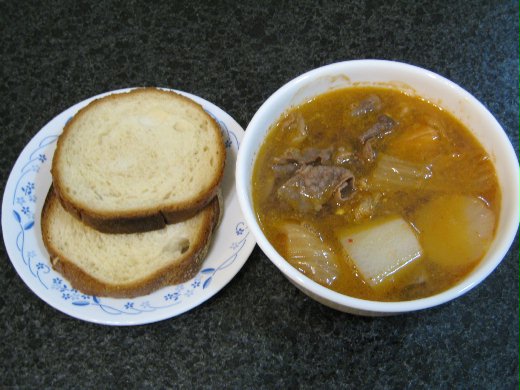 把昨晚剩下的蘿蔔湯+韓式泡菜再加幾片牛肉片另煮一小鍋湯,配上兩片麵包,就是我的晚餐