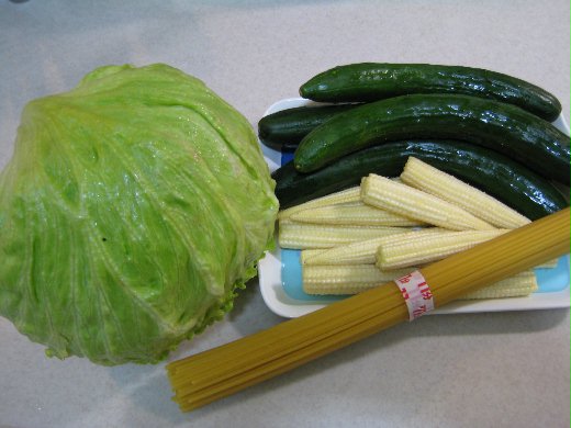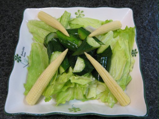 生菜沙拉是以結球萵苣 + 玉米筍 + 小黃瓜,因為買不到聖女小番茄又不想吃甜椒(因為會漲氣),所以我的沙拉只有綠色和黃色,沒有紅色,配色上有一點單調