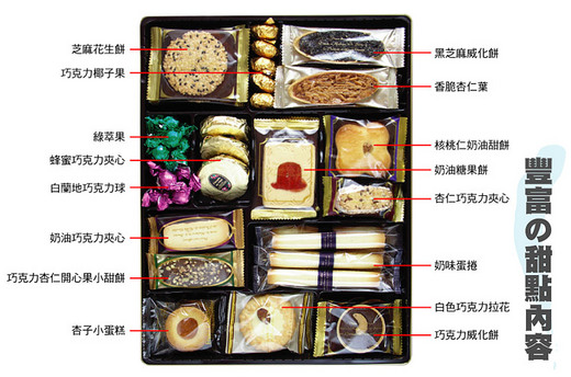 芝麻花生、白色巧克力、奶味蛋卷、綠蘋果、白蘭地巧克力球、巧克力杏仁開心果小甜餅、杏子小蛋糕、香脆杏仁葉、黑芝麻威化餅、蜂蜜巧克力夾心、奶油糖果餅、巧克力威化餅、核桃仁奶油甜餅、奶油巧克力夾心、巧克力椰子果‧‧‧‧‧