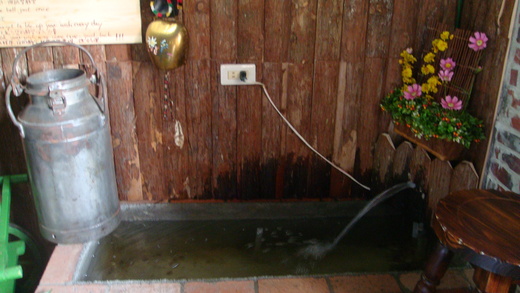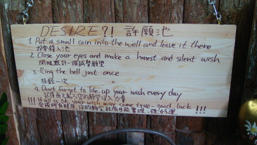 這家店生意好得不得了,離我們家車程也不出一小時,照理感覺對時應可隨時再來,但是當我看見這逗趣又怪異的許願池招徠牌時,滿腔的熱度頓時消散了。我丟一枚銀幣入池沒許願,對店家的巧思寥表意思罷了。