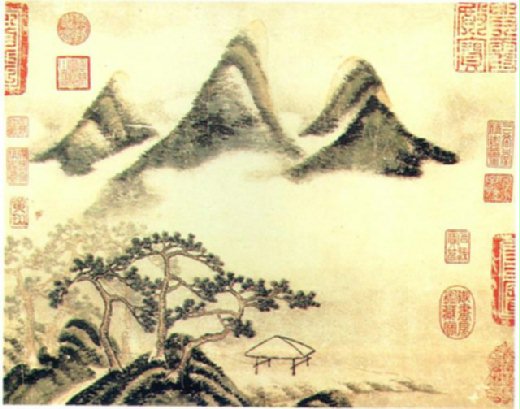 除此之外,我們可以在他的作品「春山瑞松圖」中,看見山頭以橫筆疊點,這種墨