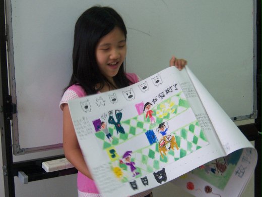 所以老師(上圖穿黑衣服低)也要我下來幫忙他們著顏色、寫故事呢!