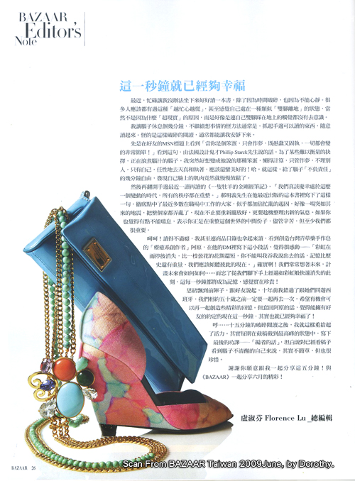 台灣版BAZAAR六月號中,非常美麗的總編輯盧淑芬在雜誌引言中提到『...在好友的MSN標題上看到「當你是個笨蛋,只會作夢,既愚蠢又固執,一切都會變得非常簡單!」看到這句,由法國設計鬼才Phillip Starck先生說的話。為了某些難以衡量的抉擇,正在滾煮腦汁的腦子,我突然好想變成他說的那種笨難,懶得計算,只管作夢,不裡別人,只有自己,任性地去天真和執著,應該是蠻美好的。....』(專欄/Bazaar Editor's Note,標題/這一秒鐘就已經夠幸福/P26)