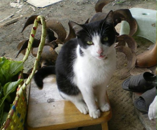 昨晚下過雨,趁早上陽光普照時,整理整理菜園和清除部份雜草。中午休息時,正享用午餐(飯團),突然出現一隻喵喵。