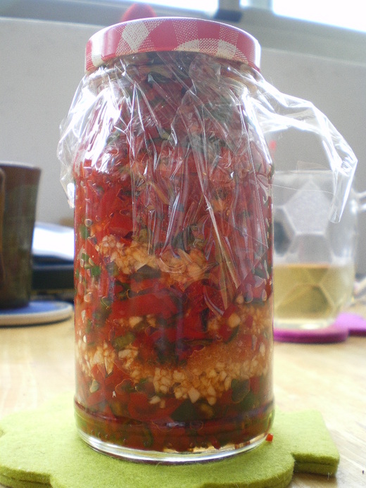 作法: 辣椒、大蒜、洗淨、風乾、去籽、切細、加鹽、裝罐、保存。