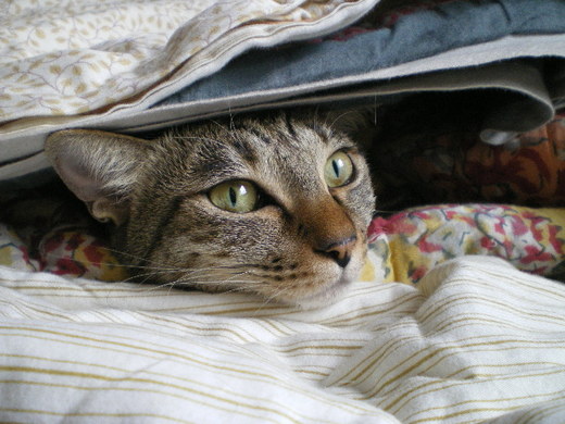 大約參考網路上的資料,開始玩起麵粉,為了讓麵團能在冷天順利發酵,把麵團放在電毯上加綿被,(吉比也趁機躲入暖暖的被裡,很可愛)發酵的效果非常好。
