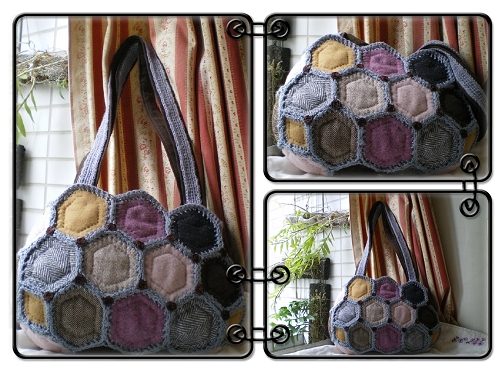 這款手提袋從夏天做到秋冬,我和Tracy在老師的書籍中看到這款圖片,興致一來馬上收集材料製作,這段過程歷經Tracy住院..我們的菜園換季..Sandy口琴練習時間..等等現在終於完成,雖然沒有原圖好看,但小提袋看來很可愛,適合這個冬天使用